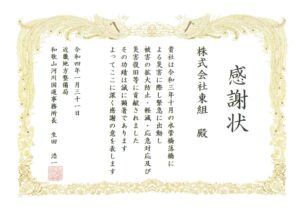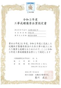 近畿地方整備局より令和3年度工事成績優秀企業に認定されました。